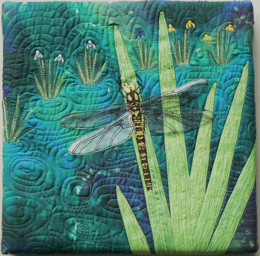 LorraineE Southern Hawker - This was based on a photo of a Southern Hawker Dragonfly which visited my pond in 2006, and spent quite a lot of time laying eggs. I could get near enough for a good photo. The body of the insect was painted first on silk, then heavily machine embroidered, then appliqued and padded, the wings are machine embroidered plastic to give the transparent effect needed. There is a lot of machine embroidery. The irises in the background are the three colours in my pond, and are machine embroidered.