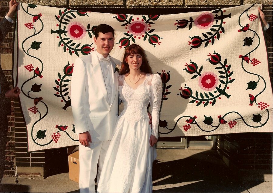 toysew Wedding Birds in a Rose Tree - This was my first applique quilt. It was made for my son's wedding and my goal was to have their picture taken on the wedding day. I saw an antique picture that inspired me. This was all hand appliqued and hand quilted.