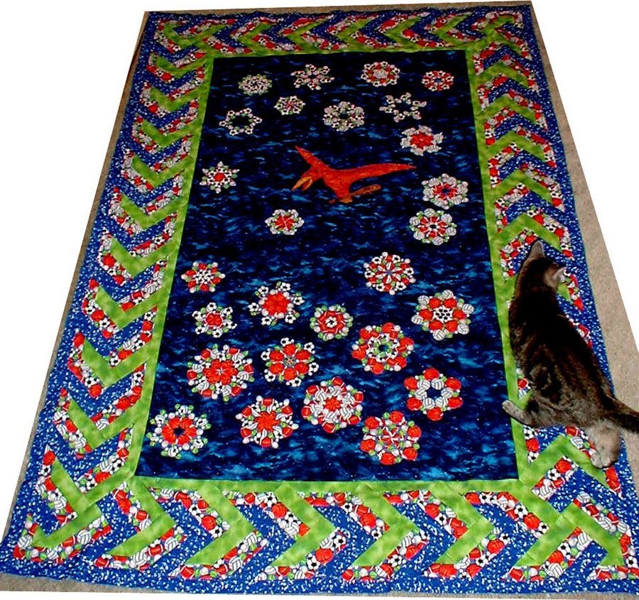 | Design Source - Description | Duvet cover for my oldest grandson's birthday. His room theme is dinos playing sports. I adapted one block wonders and appliqued interior design. |