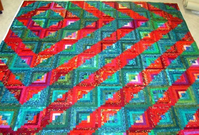 JohnNZ A New Beginning - I wanted to do a Log Cabin block quilt. Used all kinds of greens, with a bit of blue and teal, and all shades of reds with a bit of pinks and purple!