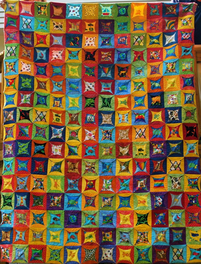 fabric100 Giggles For Mr. B - This quilt was created for my grandson's 3rd birthday and his first 'big boy' bed. The novelty prints feature things that make Brian giggle, thus the name. The back of the quilt is a multitude of brightly colored blocks.