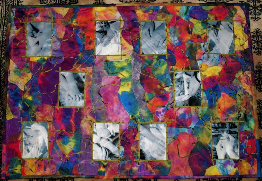 fabric100 She Worketh Willingly With Her Hands - These are photos of women's hands transferred to silk and then appliqued onto a background of raw edged hand painted silk. It is embellished with silk ribbon and semi-precious beads. This work is a testament to all that women quietly do.