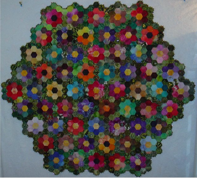 Charlotte Waiting for My Kids in My Flower Garden - Quilt top hand pieced waiting for my children during their many activities. It’s my first hand pieced quilt and I loved how the time would fly by while I was sewing. I embroidered many bugs - flying and hiding. This quilt will always remind me of their carefree childhood years. Binding is fuzzy yarn with beads attached. Back is one big pieced hexagon flower.