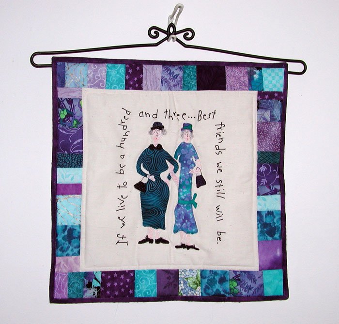 Quilter2TheMax Best Friends - I saw this wallhanging in a quilt shop in Yuma, AZ during a shop hop and there was no pattern, so I asked them if I could take a picture of it so I could make one, and they said yes. I think it was originally some kind of panel. It reads, "If we live to be 103, best friends we still will be." I made this for my sister, whom I adore! She loves it!