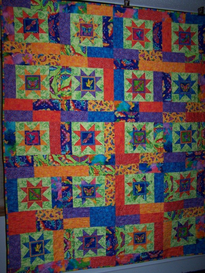 blockmastr Flights of Fancy - This quilt is made from Laurel Burch fabrics from her Flights of Fancy collection. I made it while evacuated for Hurricane Katrina--I wanted to make only happy quilts. It has Swavorski crystals detailing each bird, butterfly, or dragonfly in the star centers.