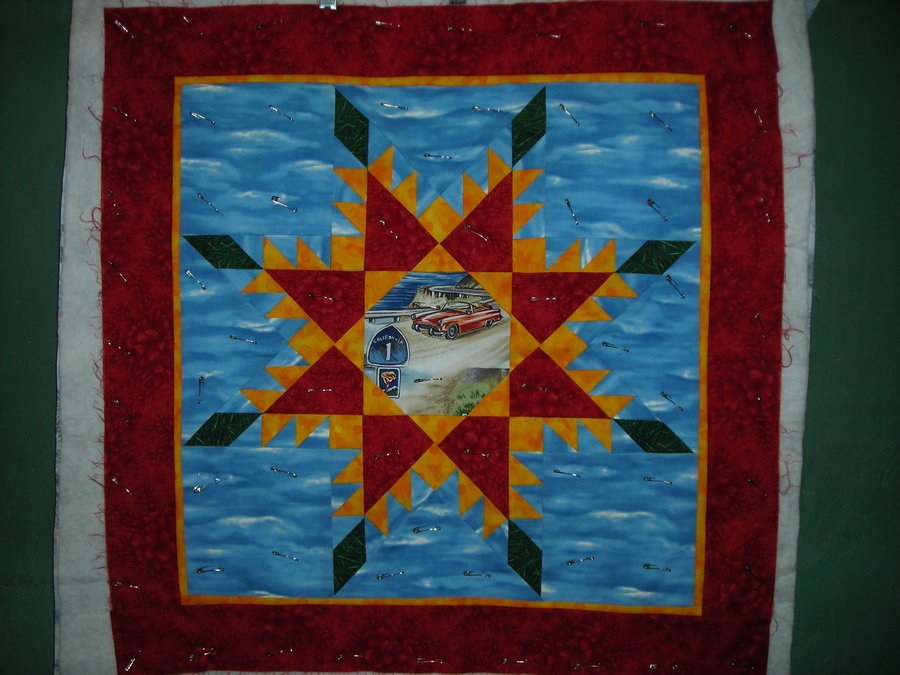 quiltzyx Blazing Star to California - WIP - This was made in a TLC Quilters' guild workshop given by Ann Turley. I started with the center fabric - the theme fabric from the Road to California Show this year - and picked my colors from that piece. This was Ann's paper-pieced pattern, and we sewed no "Y" seams! If you ever have a chance to take a class from Ann - DO IT!!! You will have a blast!
