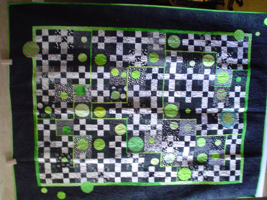 jbquilts Dot-to-Dot - This quilt uses simple 9 Patch blocks but the layout and design of adding the circles and the green fabric line inserts is my own design. This quilt was done in a nine patch swap. The 9 patch blocks were made by Lisa Marshall, Teresa Covington, Susan Nolen, Diane Hunter, Sandy Brown, and Shelley Caramanian. Once I received the 9 patch blocks I added the pieced circles into the layout. I also added green lines inserted between blocks.