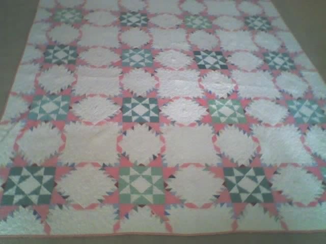 | Design Source - Description | Pink and green on white background with pink backing. Thought to be made by one of my husband's grandmothers. Undure of date perhaps 1940's or 1950's. Completely hand made. |