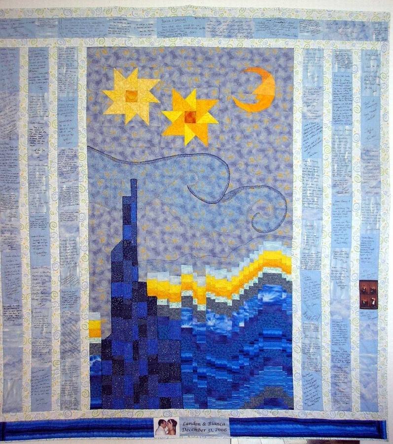 | Design Source - Description | A wedding quilt I created with a border of signature blocks signed by wedding guests at the reception. Theme of wedding was Vincent Van Gogh's Starry Night, which I incorporated in the center. |