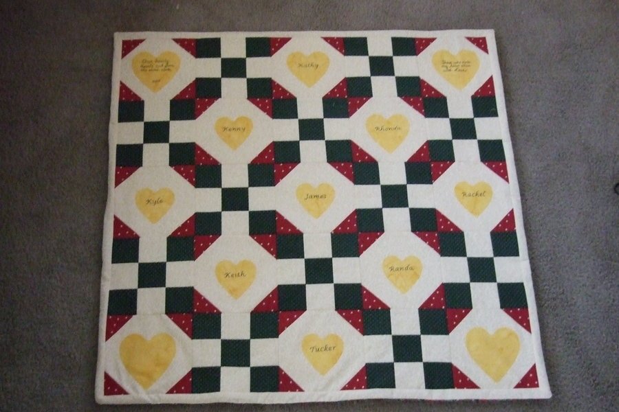 MarianneS Sharon's Family - Throw for a cousin that allowed a heart to represent each member (children and grandchildren) of her family. Colors choosen for a country feel and allow hearts to shine.