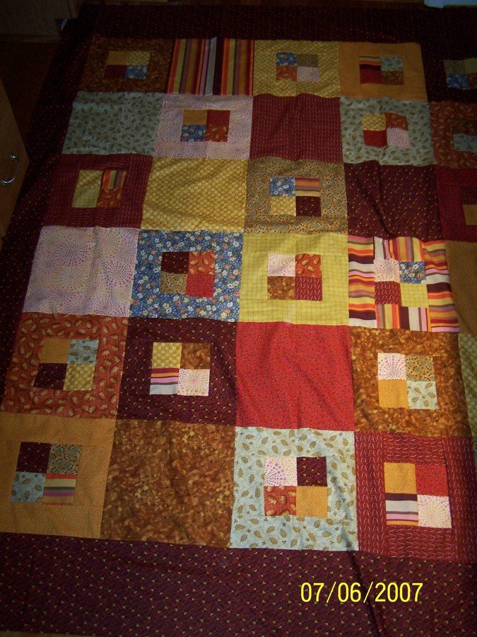 QUILTLOVERS QUILTS MADE FOR IRAQ SOLDIERS - THIS QUILT WAS PUT TOGETHER WITH 13 DIFFERENT FABRICS CHOSEN FOR OUR SOLDIERS IN IRAQ. I HAD A CUSTOMER COME STATING HER BROTHER IN IRAQ WANTED A QUILT BECAUSE THEIRS WERE VERY OLD AND THEY HAD TO SHARE MOST OF THE TIME. SO I DECIDED TO MAKE IT A MISSION AND BEGIN TO GET FELLOW QUILTERS TOGETHER TO MAKE QUILTS FOR THE SOLDIERS. I AM TRYING TO FIND THOSE THAT NEED THEM BUT WILL SEND SO HOPEFULLY ANYONE WHO NEEDS THEM WILL GET ONE. I AM HOPING THE SHOP WILL BE ABLE TO SEND AT LEAST 50 QUILTS SO AM REALLY PUSHING THIS PROJECT. JUST STARTED LAST WEEK AND ALREADY HAVE FOUR SO MAYBE I WILL MEET MY GOALS!!!!