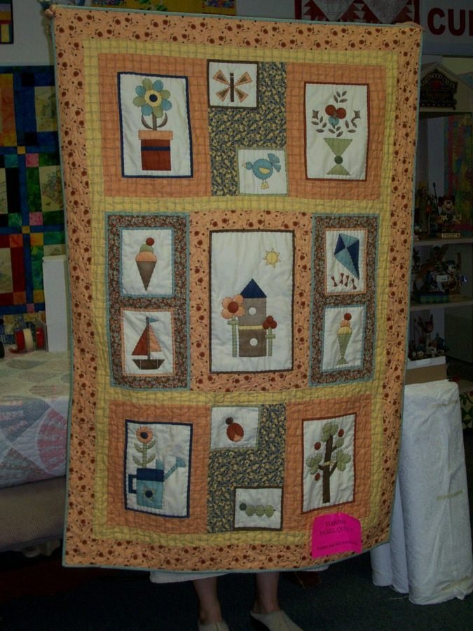 QUILTLOVERS VISIONS - THIS QUILT WAS INSPIRED BY THE PANEL IN THE VISIONS COLLECTION BY MODA. I USED THE DIFFERENT PICTURES ON THE PANEL AND COMPLIMENTARY FABRICS TO COME UP WITH THE DESIGN. I THEN BIG STITCH QUILTED IT. IT TURNED OUT REALLY GREAT AND I WROTE IT UP AND ACTUALLY SOLD IT AS A KIT AT THE SHOP!!
