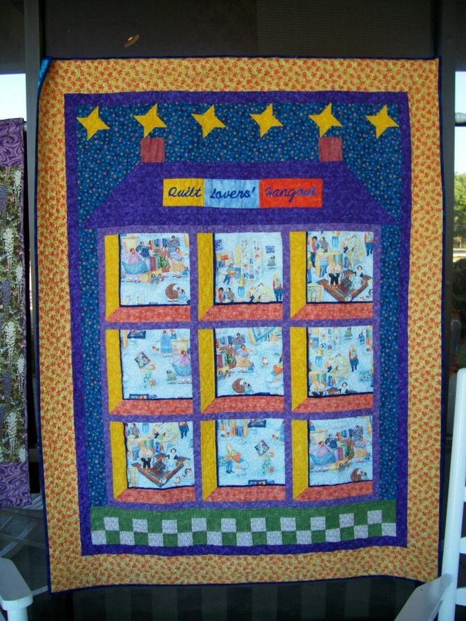 QUILTLOVERS QUILT SHOP QUILT - I MADE THIS QUILT FOR THE SHOP WITH THE SHOP NAME EMBROIDERED ON THE ROOF TOP.I SAW A QUILT PATTERN SIMILAR AND USED IT AS A MODEL BUT HAD TO DO QUITE OF BIT OF ADAPTING. I USED ATTIC WINDOWS TO MAKE IT LOOK LIKE YOU WERE LOOKING INTO A SEWING "HOUSE" OR SHOP. WE LOVE THIS QUILT AND HANG IT OUTSIDE THE SHOP HOWEVER IT IS STARTING TO REALLY FADE SO I AM GOING TO HAVE TO COME UP WITH ANOTHER.