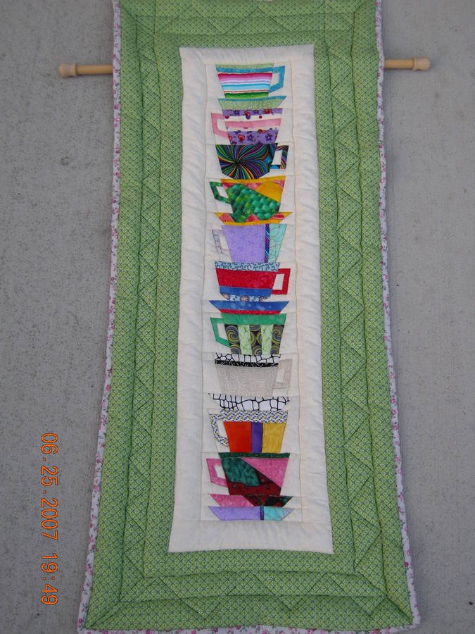 vampyrmom Teacups for Jeanne - After taking a class to learn paper piecing, using the above book, I took off on the one cup we learned, got the book and made this quilt. I used fat quarters. The patterns were also reduced to 75% of the originals in the book. It is all cotton fabrics. I think I used the wrong material for batting - fiberfill - because it was rather thick and difficult to quilt.