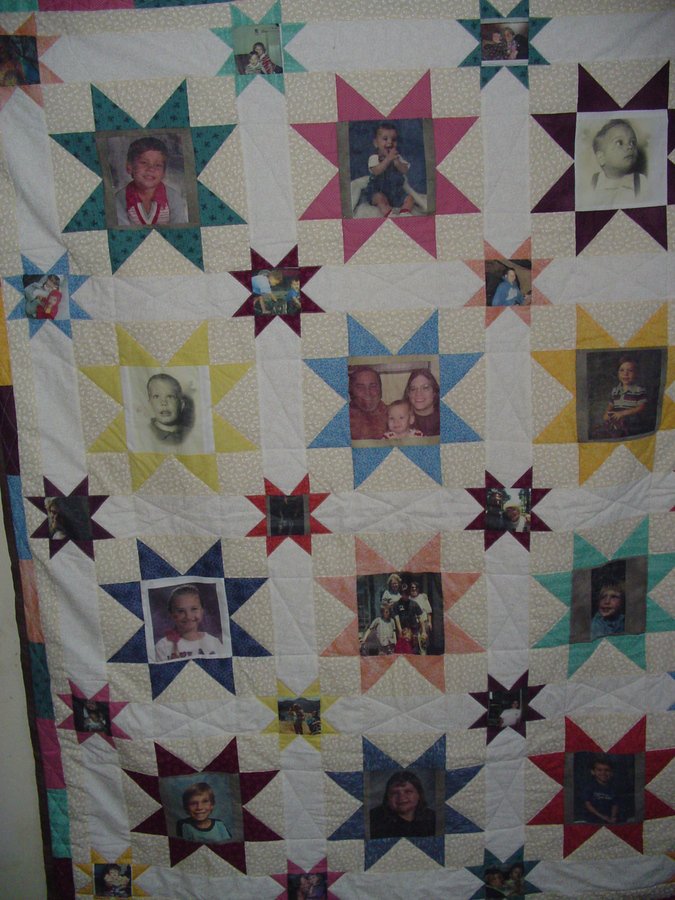 | Design Source - Description | Quilt made with pictures of my Mom's kids and grandkids in the center of the star |