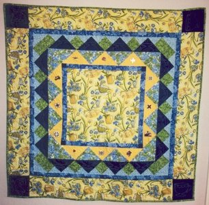 sewugley Tea for Two - I saw this quilt pictured in the Quilter's Keepsake catalogue and fell in love with it. I love the combination of soft yellow and blue and this was it. I ordered the kit immediately and made the wall hanging. I have it in my bedroom and have used it to put all my quilt pins for display. It was great fun to make and free motion quilt. I have gotten several positive comments on it, and as I said, I really love it.