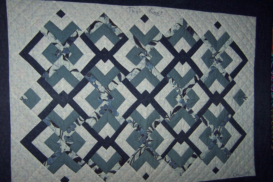 purpleq Thai Knot - My niece married a man from Thailand and for the wedding I made this Lovers Knot quilt. It is made with dark blue, light blue blue and white print with a white back ground.