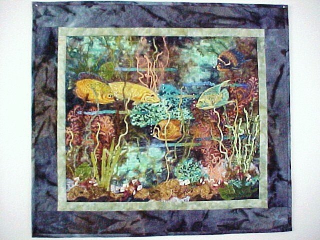 dorene3 Ocean Flora - This quilt combines several techniques, applique, thread painting, and embellishment, using a variety of materials including silk flower parts and shells