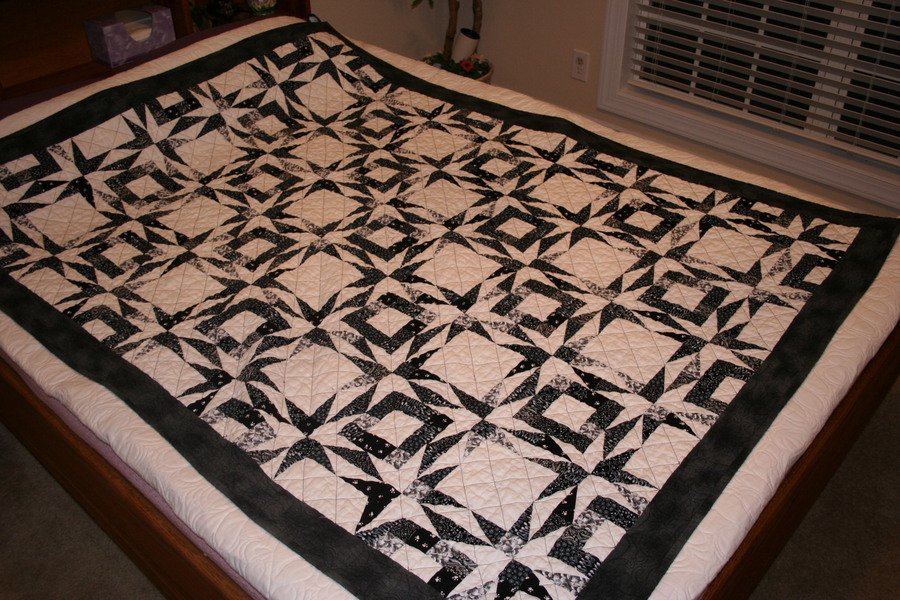 NanaBamaQuilter Black & White All Over - This pattern was designed by Nancy Smith and Lynda Milligan. It was originally made in reds and whites, but my son wanted a "black" quilt. He also instructed the quilt be large enough to totally cover him while lying on the sofa, hence the size!!!