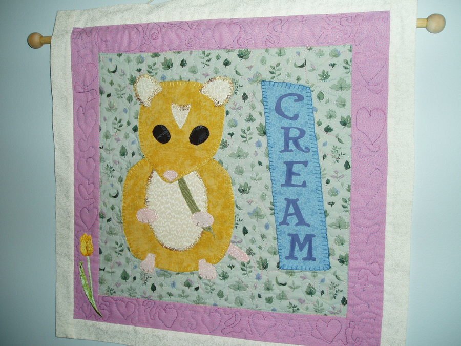 | Design Source - Description | ALLYSSA, 10 YEARS OLD, DID THE DRAWING OF HER PET "CREAM", AND SHE PICK OUT THE FABRICS AND WE WORKED TOGETHER ON THE QUILT. |