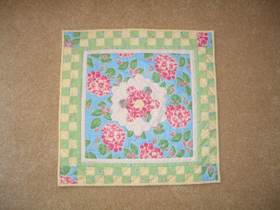 kplaposata Checkerboard Paths Around My GM's Flower Garden - I had always wanted to try this pattern, but don't have the patience for hand piecing an entire quilt. The fabric was provided as part of my local quilt shop's contest to interprete feelings of spring.
