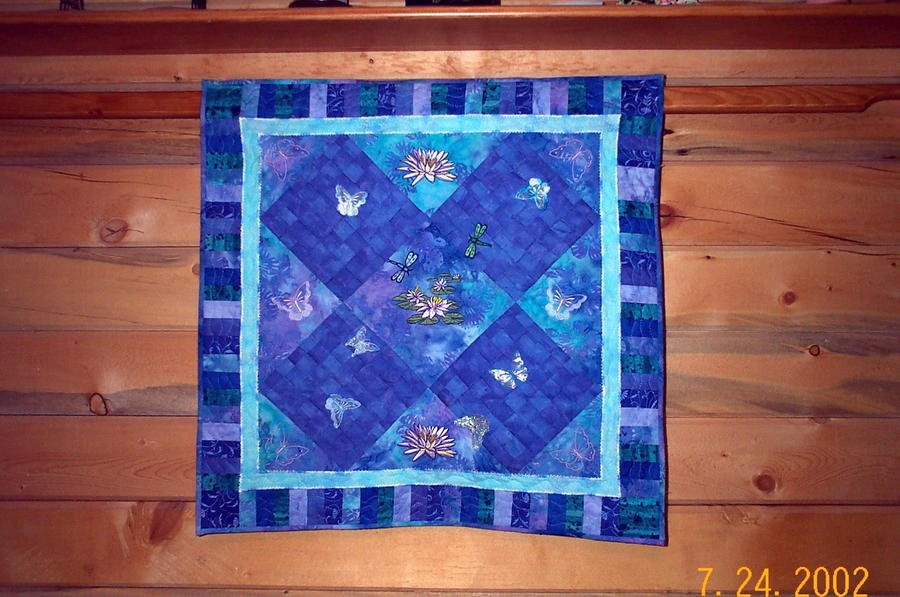 debr33 Virginia's Water Garden - This Quilt was to be a present for my Mom. My mom passed away before it was finished, so I finished it in her honor at the first anniversary of her death. There are woven blocks and embroidered butterflies and water lilies.