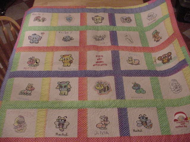 luvmylongarm Kid Art quilt - these quilt was made by me and children. I embroider the blocks with my machine and the children colored them in. Then I added sashing and borders. It was fun having the kids get involved.