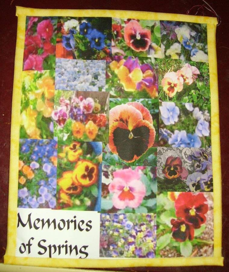 1kwltr Memories of Spring - Collection of pansy pictures, collaged, and printed on fabric. Quilt made for Alzheimer's Art Quilt Initiative-raised $15.00 for the cause.