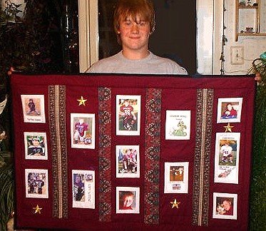 Hekate Cody's 12th Birthday Memory Photo Quilt - This wall hanging was made for my Grandson, Cody. It reflects his famous football career.... and for me? Made me cry to see the GrandBaby growing up so fast!