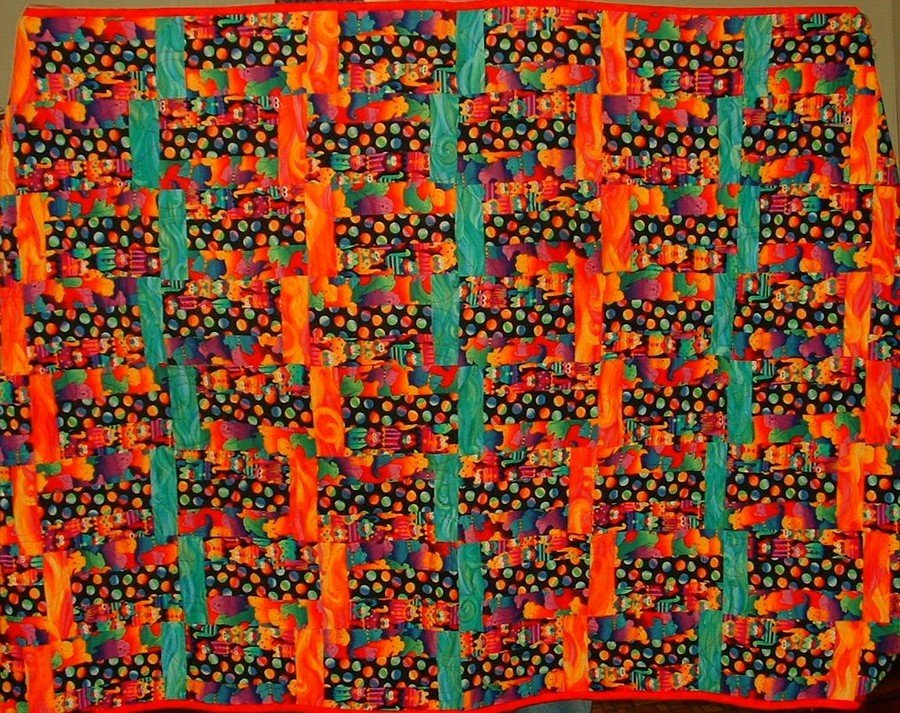 QueenPatty Produce - I had been taking classes and avoiding a commitment to a real quilt, when my husband said it was time to PRODUCE. I had already managed to acquire a small stash. so one day at my local quilt shop a friend helped me cut out the stripes and couched me on what to do next. I never saw a pattern just did what my friend told me to do. When deamed large enough for a twin bed. I sewed it all together. Went home that evening with a finished top. Husband was impressed. and that is why this quilt is caled produce..