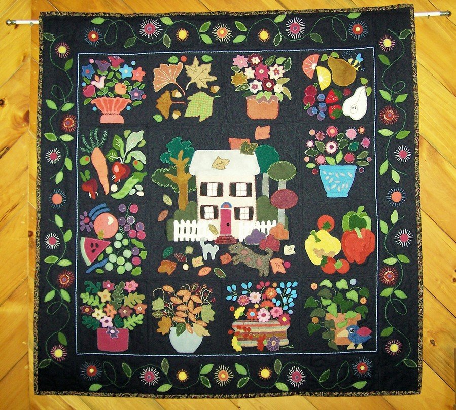 linmcquilter Home & Harvest - Hand-dyed felted wools appliqued on black wool and hand-embroidered with button-hole stitch and french knots. I gathered the wool myself, rather than purchasing the fabric kit, and also felted some of the wool myself. Quilt has a house with a picket fence, dog, cat, and fall leaves. Blocks surrounding the house include floral, fruit, and vegetable arrangements. The blue accent between blocks and the appliqued border is embroidered with pearl cotton. The quilt blocks were pieced together by machine and also lightly quilted by machine. The batting is a thin blanket. The backing is the same fabric used to bind the quilt. This is my first attempt using wool, and I love it! Presented to my eldest daughter, Lisa, as a house-warming gift Jan. 2008. Made a 2nd one this year, almost identical, to give to my daughter-in-law, Jenny, for a Christmas present.