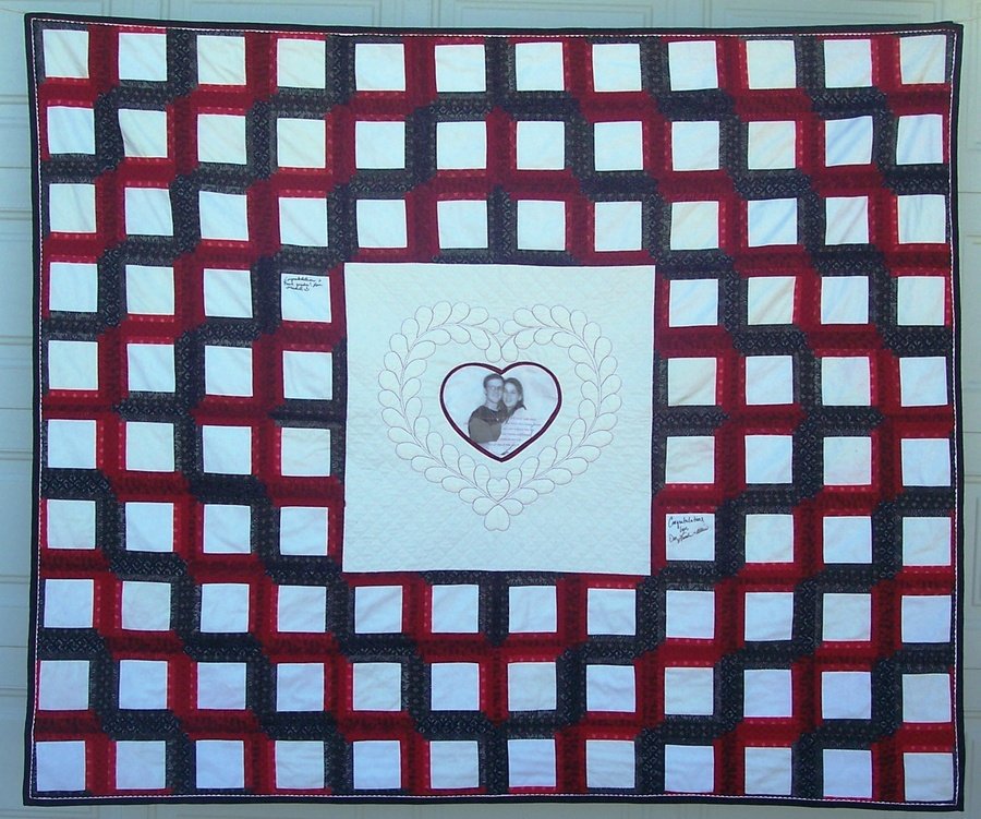 | Design Source - Description | Made for our God Daughter for her wedding. I used log cabin signature blocks for family & friends to share warm wishes with them on their special day. |