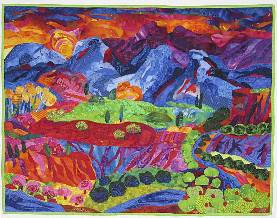 rel319 Santa Fe Morning - The fabric on this quilt was fused, then free motion sewing was done. To add a little more depth, I used a built in decorative stitch around some of the areas.