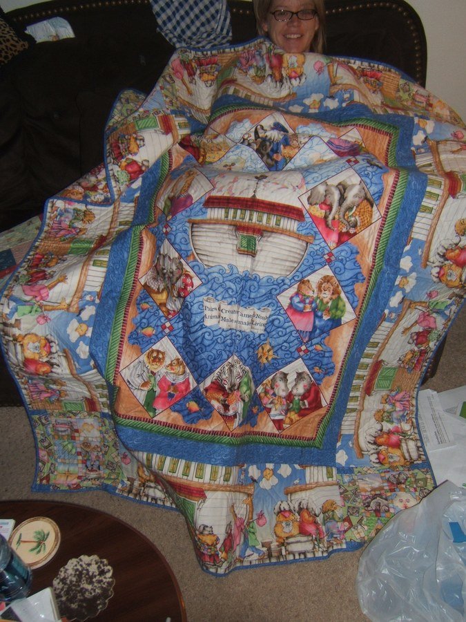 tells Noah's Ark - This is a panle that I set with a border fabric and some nine patch corner units. I gave it to my first (and only)grandson.