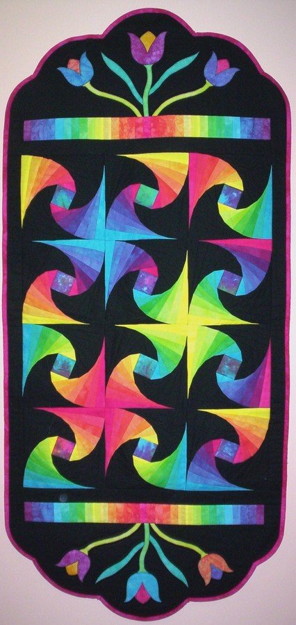 milduragirl Twisted Tulips - Centre of quilt machine pieced using Twisted Log Cabin technique. Top and bottom borders machine appliqued. Uses a colour wheel of 18 fabrics. Made from my own Country Dye Works hand dyed fabric.
