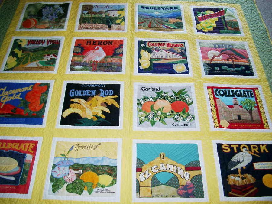 sherrybaby Claremont 2007 Centennial - 16 individually designed squares. Each square is a replication in fabric of an historic citrus crate label. All 16 labels originated in Claremont CA in the early 1900's. Fund raiser; will be raffled Oct. 27, 2007.