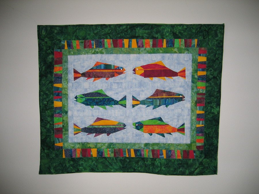 Kristin1 Fisherman's Dream - This is my first and only paper pieced project. This pattern was taught in a class at a my LQS, but I had not known about it. The only instruction on paper piecing I had was a private lesson of 15 - 30 minutes. I thought I would lose my sanity making this quilt. Each fish block has approximately 45 pieces. And sewing upside down and backwards was challenging, especially for someone with spatial issues! Unfortunately, I didn't do a very good job squaring this up, but I like it anyway!