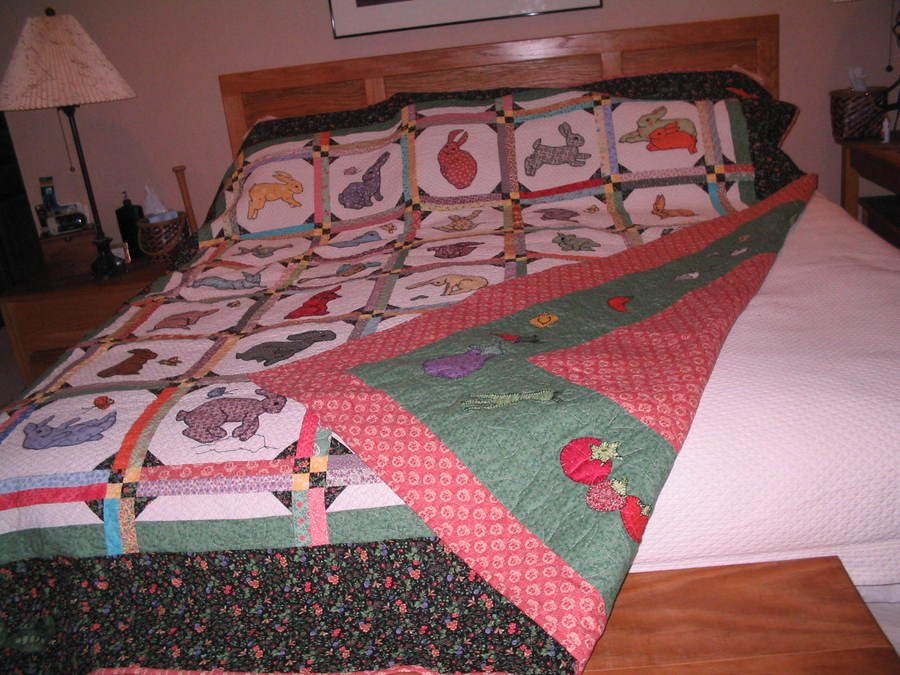 joannyoung31 Mr. McGregor's Garden - 30 different appliqued bunnies by hand and blanket stitch outline of each, each made with small prints and put together with patchwork strips and small four square corner stones. Queen size, bottom corner borders have carrot and peas appliqued, back has appliqued vegetables around the edge.