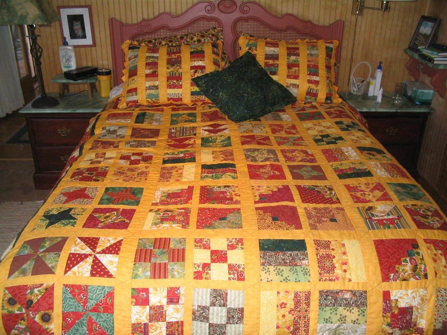 joannyoung31 Colorado Sunflowers - using rail fence, 9 patch and 9 patch variation, flying geese, log cabin and friendship blocks set together in sets of 4, then sashed together using fall colors accenting the sunflower golds. It is edged with gold triangles to simulate petals. Border is soldiers made from strips of all fabrics used. I started this in my first quilting class, the project was a small sampler quilt which i made into a queen size.