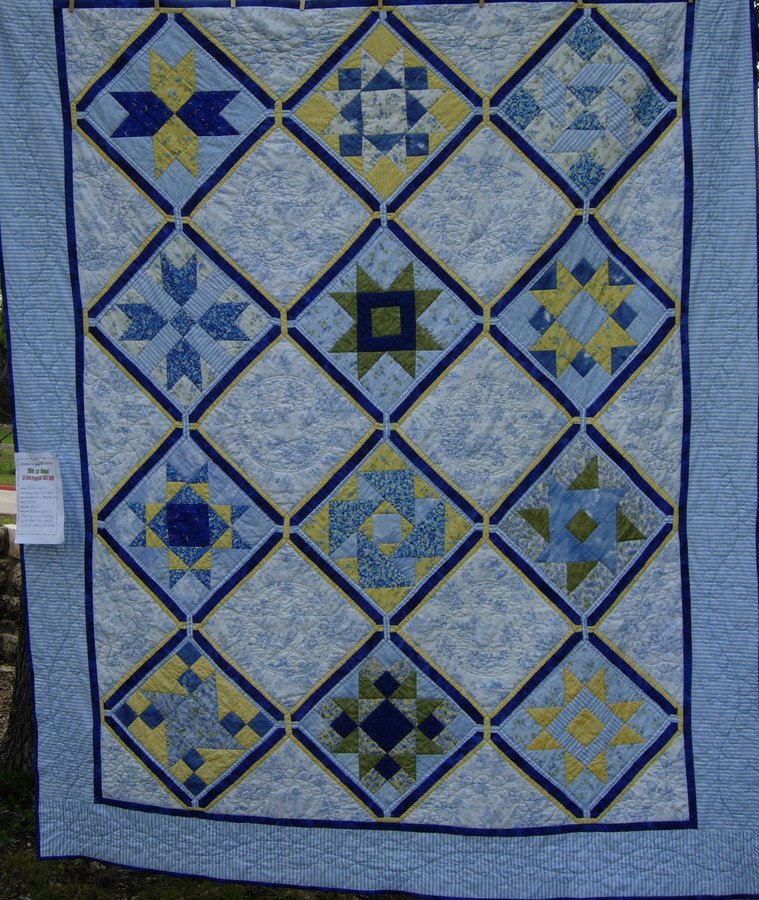 rloyd Stars Over Texas - Twelve stars made using mostly Moda Hill Country Fabrics, The setting pieces are Hill Country Toile, and the border is the Hill Country Stripe. I live on the leading edge of the Hill Country in Texas, so this quilt fits perfectly into my home decor! .