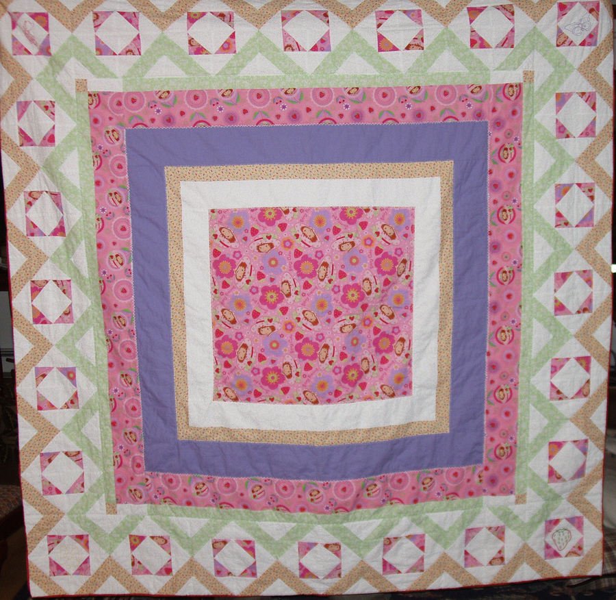 Quiltdog Mia's Quilt - Strawberry Shortcake theme fabric with Machine embroidery.