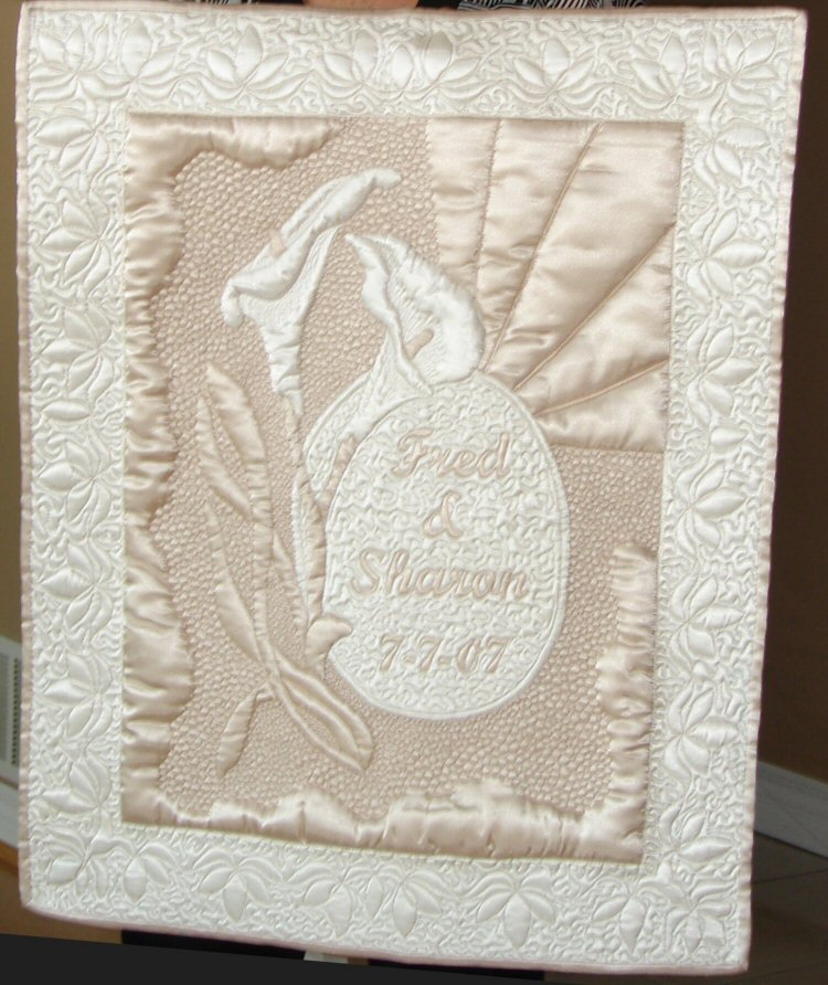 | Design Source - Description | Designed as a wedding gift and made out of two shades of washable chamuese satin. Techniques used were turned under applique, applipiecing, and trapunto, along with heavy freemotion machine quilting. |