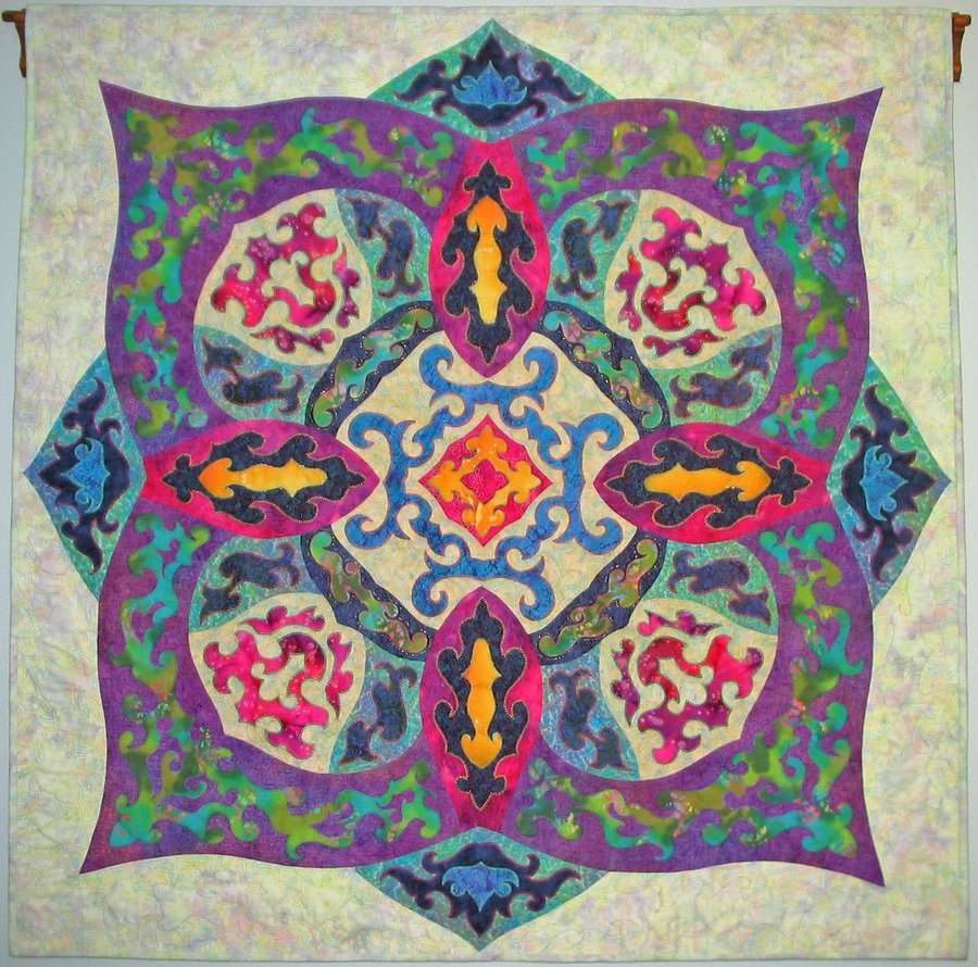 DaphneGreig Arabesque - Arabesque relates to the decorative melodies of classical music. This ornate and symmetrical design incorporates curves and intricate geometric patterns. I concentrated on colour, shape, line and decorative quilting designs. All curves are machine pieced.