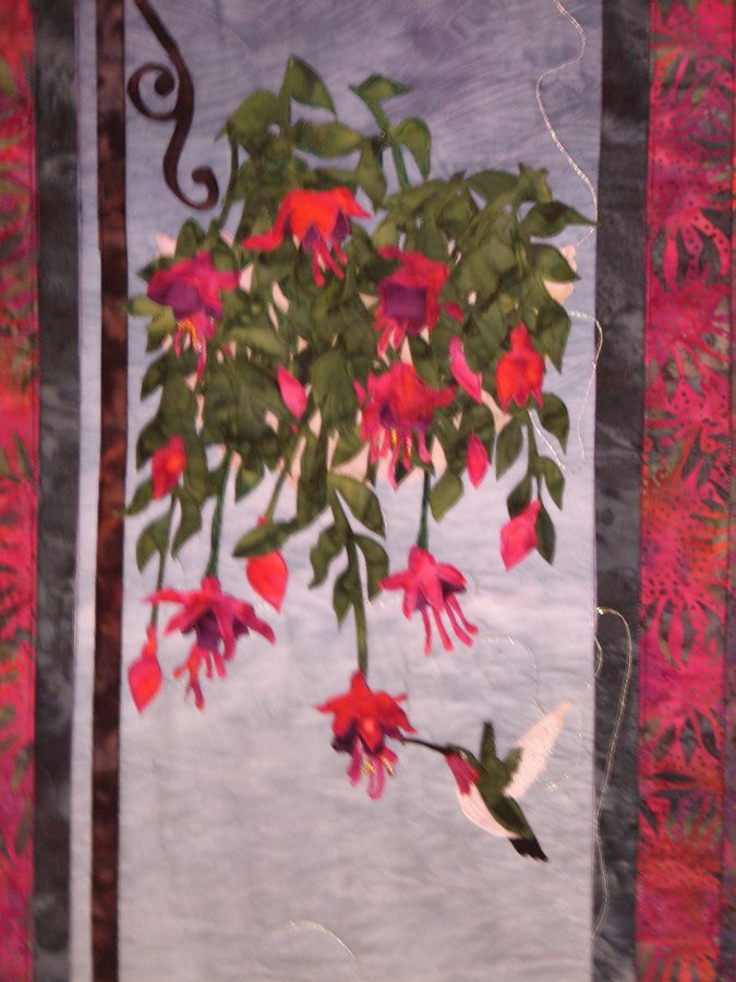 | Design Source - Description | Applique of a hanging basket of fuschia blooms with 2 hummingbirds. Embellishshed with beads and ribbonwork |