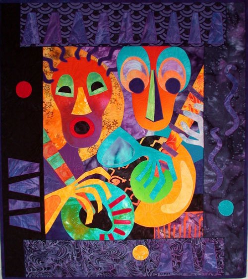 kitkavitch Corner Musicians - I loved the brightly colored African designs that were in a calendar once owned. This quilt is an attempt to work in that style. Started in a Jane Sassamon workshop.