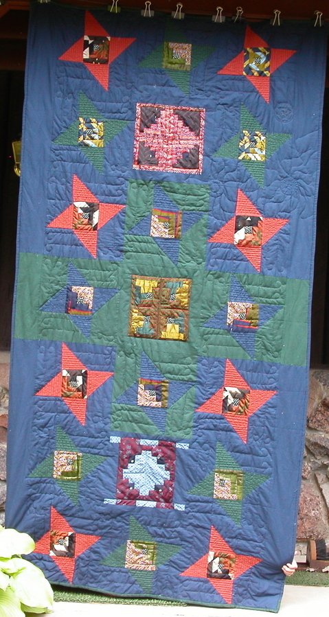 cactusbasket It Was Suppose To Be A Skirt - Some time in the early 1970’s my husband saw a women wearing a skirt made entirely of neckties. The narrow end was at the waist and the wider kite shaped end was the hem. He thought that was very clever and cool. For the next 30 years when he was at a rummage sale he would buy neckties so I could make this skirt. He kept them in a brown paper bag which followed us around on our various moves and now and then would ask me when I was going to make that skirt. I didn't want a necktie skirt. So I told him I would make a quilt out of the neckties he had collected. I learned that neckties are made on a bias and they slide around when sewing them because of this they are Crazy Log Cabin blocks. Also, they looked terrible next to one another and needed nice solid blocks of color to set them. It has lots of errors, chopped off points, the logs don't match up and the necktie material puffs up, but it very cuddly and lives on our sofa.