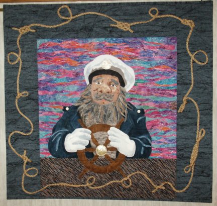 Loisped Captain's Delight - The background is sliced batiks fused and stitched in place with sliver threads. Then the Captain was drawn and pieced in fabric then raw edged in place. The nautical rope and knots bring the border into the nautical theme.