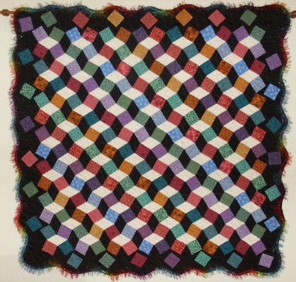 Loisped Cascading Colors - This was begun in a class with Jan Krueger based on a design by Mary Ellen Hopkins. I appliquéd the colored squares around the edge to simulate colors cascading off the design. Then the quilting flows in a random manner to add movement. Finally I curved the borders and couched on multi-colored yarn to complete the quilt.