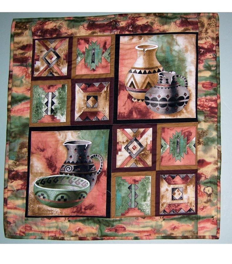 azquilting Southwest - I found this panel in a small quilt store in Northern AZ and brought it home hoping that it would go in my husband's den. Voila! It was just the perfect color. I haven't made a panel for a long time and since I was in a hurry to get it on the wall, just outlined the panel instead of cutting it up and making a larger wall hanging. It turned out to be the perfect size for over his desk and looks great in the room (if I may say so myself).