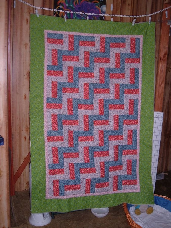 Baglady1546 Betsey's Rail Fence - Green Border with Red and Blue prints made for 10 yr old Betsey's mother. Betsey's mother was killed on Mothers Day before quilt was given to her.